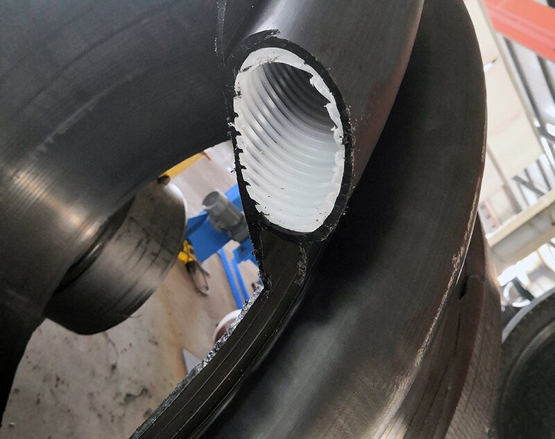 1.热态缠绕成型熔缝质量高 从挤塑机口模挤出的处于熔融状态的平料带和U型料带,按预定的位置均匀的缠绕在加热的滚筒模具上,保证了结构壁管熔接缝质量。特别是结构设计中平料带的熔接缝被聚乙烯包覆支撑管所覆盖,提高了制品整体的抗外压能力